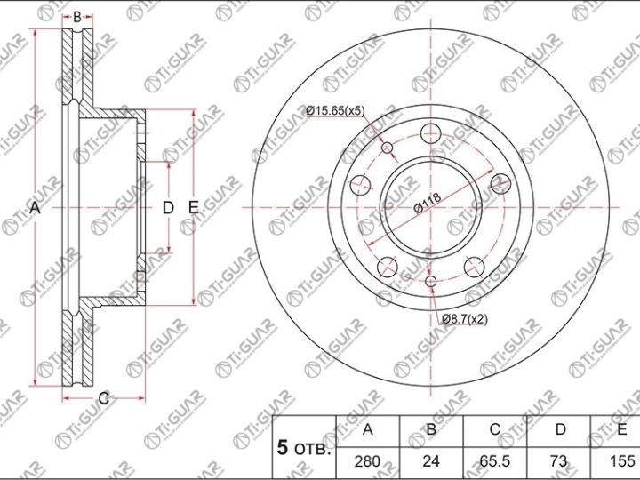 Диск тормозной /передний /TI-GUAR для FIAT DUCATO 1994-, CITROEN JUMPER 1994-, PEUGEOT BOXER 2002- /до 1,5 тонн; 280/24ММ; TG-51848618 9893120 GR02823 71738905 4249K3